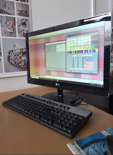 | Laboratorij je opremljen s petimi delovnimi postajami za konstruiranje in vzorčenje listnih in žakarskih tkanin, ki omogočajo izdelavo simulacij tkanin po zahtevah naročnikov ali na podlagi idejne skice študentov. Prednost uporabe CAD sistema je možnost takojšnjega zaznavanja sprememb konstrukcijskih parametrov tkanin in zaznavanja barvnih učinkov novo ustvarjenega desena, s čimer je olajšano kreativno oblikovanje in konstruiranje novega izdelka - tkanine. Izdelane barvne variante vzorcev tkanin posredujemo v elektronski ali papirni obliki, ki že skoraj v celoti zamenjujejo klasično izdelane kupone. S pomočjo programa ArahDrape je možno prikazati tudi vizualizacijo tkanine v konkretnem končnem izdelku glede na njen namen uporabe. | ![]() |